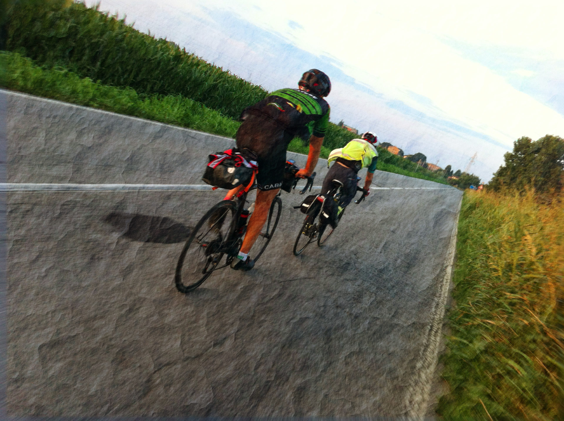 Quando non sai più cosa stai facendo, quando non sai più che stai pedalando, non puoi neanche più fare fatica. Questa sensazione prende vita col passare dei chilometri e si affranca definitivamente sul finire del quarto giorno. Deve viverla anche Enrico perché incomincia a fare strane domande. Non riusciamo ad arrivare un giorno prima? Tra i miei compiti, all’interno del nostro connubio ciclistico, c’è quello di mantenere stabile il livello dell’umore che quindi alzo o abbasso a seconda delle esigenze, per cui predico calma, ma non posso negare a me stesso che ci si può provare.
