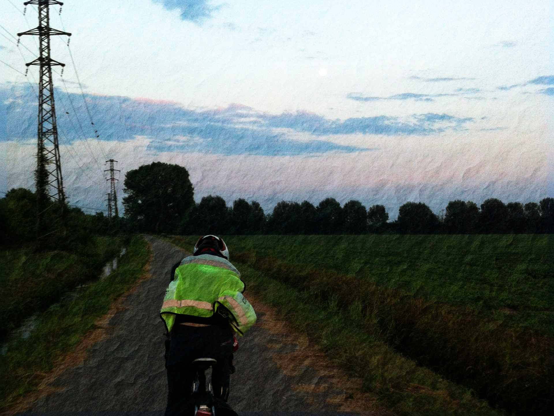La giornata è calda e il tracciato è per lunghi tratti sull’argine del Po. Il fiume procede lento nella nostra stessa direzione e rende immutabile l’ambiente circostante. Sembra di non progredire. Ma lo spirito è alto. Enrico, Yama e io ci diamo cambi regolari. Passo il tempo a pensare a quanti chilometri mancano, sperando di aver sbagliato in eccesso il calcolo che avevo fatto cinque minuti prima, che però è sempre giusto.