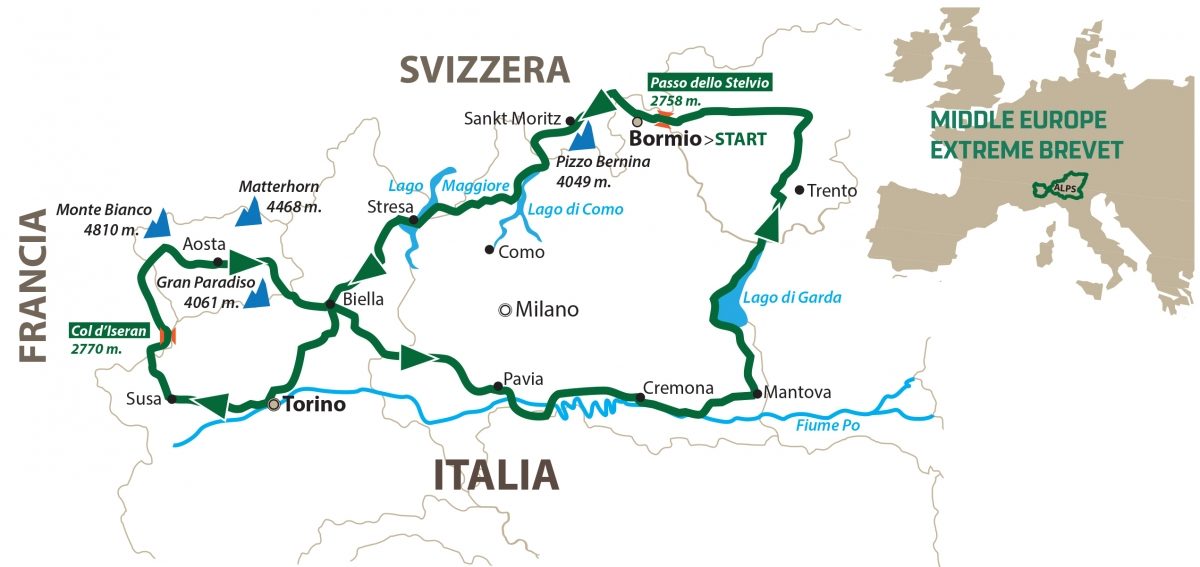 Bormio – Passo del Foscagno – Passo d’Eira – Forcola di Livigno – Passo del Bernina – Sankt Moritz – Passo del Maloja – Menaggio – Lugano – Luino – Laveno – Biella – Venaria Reale – Susa – Passo del Moncenisio – Col de l’Iseran – Piccolo San Bernardo – Aosta – Biella – Pavia – Cremona – Mantova – Desenzano – Riva del Garda – Andalo – Valle di Non – Passo Palade – Merano – Prato allo Stelvio – Passo dello Stelvio.