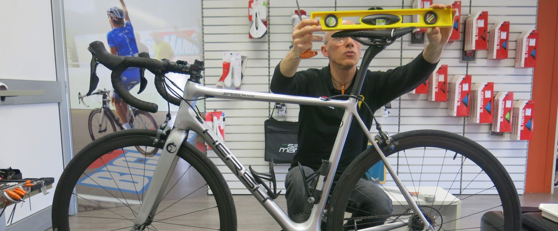Prese le misure personali, il test è proseguito su un finto telaio, che grazie a vari snodi e regolazioni riproduce le misure ideali, e sono state poi riportate sulla mia bici, il che non mi convince molto; se – come sostengono loro – siamo qui a parlare di millimetri, basta sbagliare di un millimetro la lunghezza di un tubo o di un grado un angolo del falso telaio che tutto sballa.