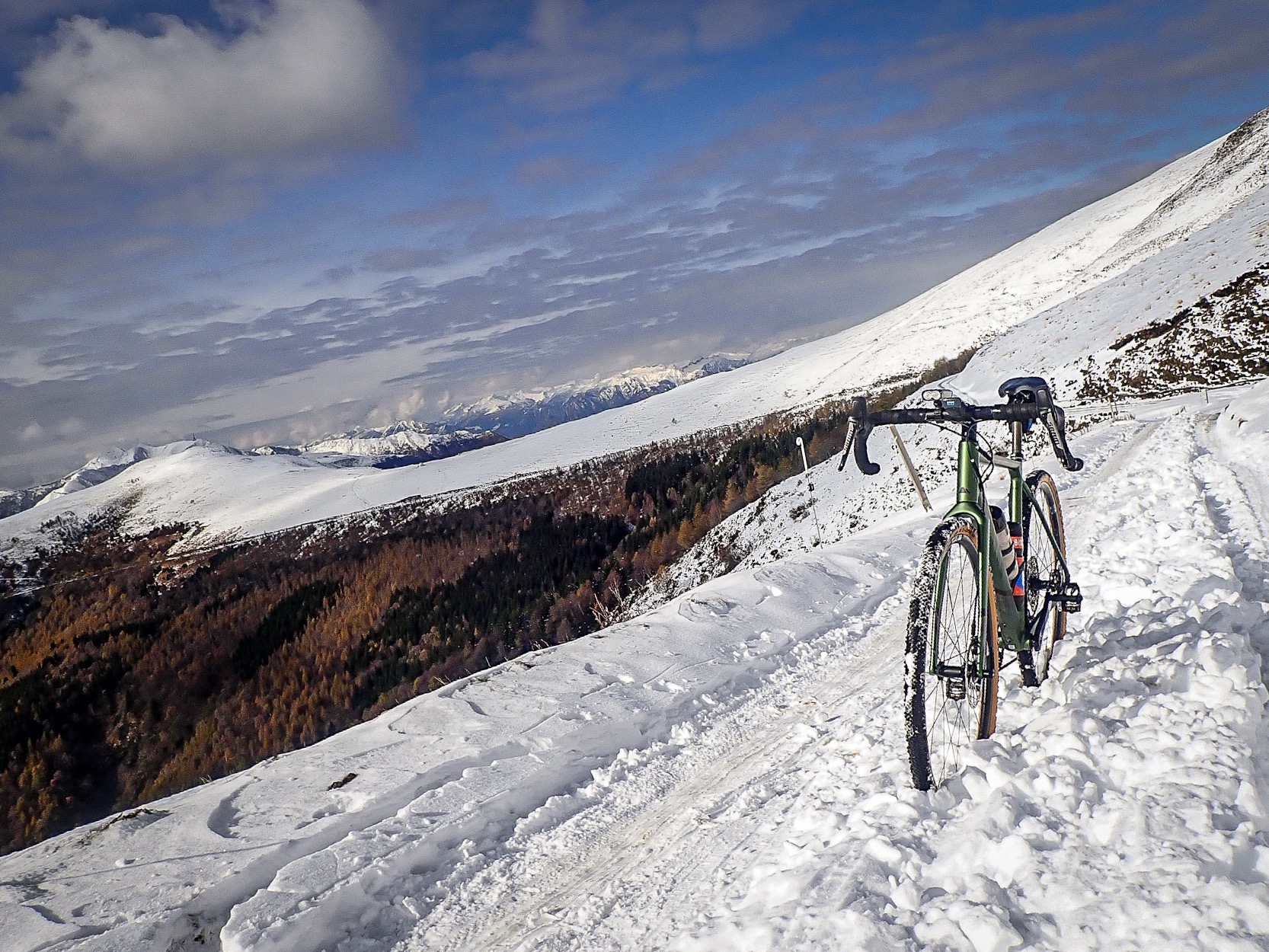 L’ultimo chilometro prima di raggiungere la capanna, solitamente sterrato, è completamente coperto di neve misto ghiaccio, una bella sfida. Superando fossi e parti irregolari di neve sciolta riesco a mantenere l’equilibrio e la Canyon non mi abbandona un attimo guadagnandosi il mio rispetto e stima. Grip al top.