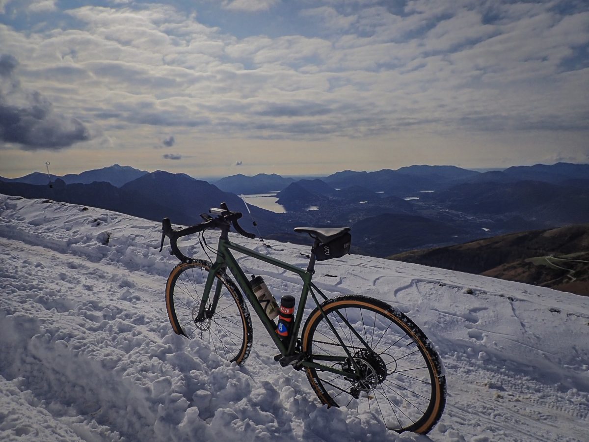 Allo stesso modo l’impugnatura sul manubrio è molto confortevole e mi permette un buon controllo. Esco dallo sterrato per approcciarmi a circa un 4 km di discesa su strada. Posso quasi permettermi di non frenare, la tenuta di strada è notevole e la guida divertentissima. Mi prendo il tempo per scattare qualche foto e alzare il drone, dopodiché vedendo la neve in lontananza sul Monte Bar non resisto e mi ci dirigo.