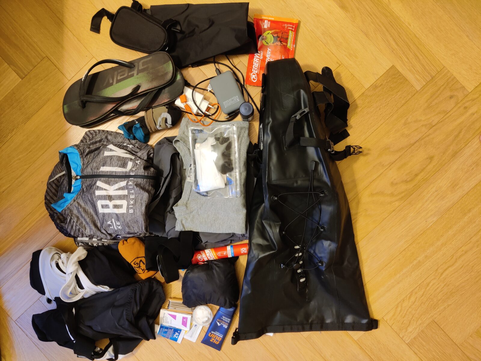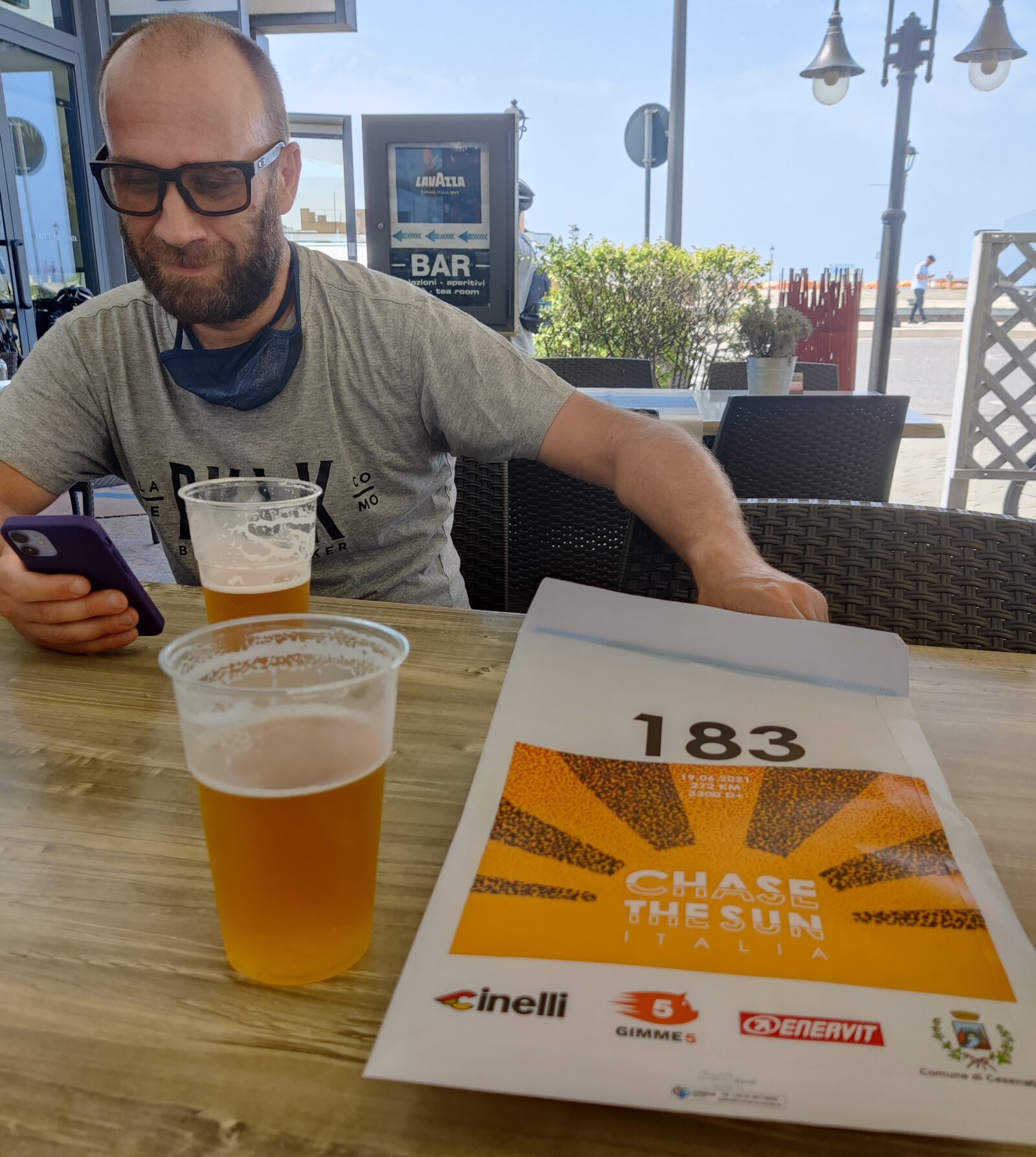 Ritiriamo il welcome kit per cui iniziano a trasparire dubbi sulla proporzione del costo di partecipazione di €170. Un ragionamento che si è riproposto più volte durante l’evento: un unico ristoro su tre con del cibo. Negli altri due troviamo solo lo spazio a noi dedicato. Un gel e una confezione di sali per 270km, uno scherzo? Per contro la borsa per il manubrio è perfetta quantomeno nelle dimensioni, purtroppo quando la apri ogni volta è un gioco di equilibri per non farne uscire il contenuto. Team abbastanza scazzato all’arrivo, che a fatica ti allunga una bottiglia d’acqua e il cappellino finisher di plastica che fa impallidire anche Greta. Recuperiamo con la gran cena finale fatta di antipasti, doppietta di pasta con cozze e fritto misto. Ma l’amaro in bocca non riusciamo a toglierlo. Tiriamo le somme sperando che l’extra sia necessario per mantenere l’associazione che organizza l’evento.