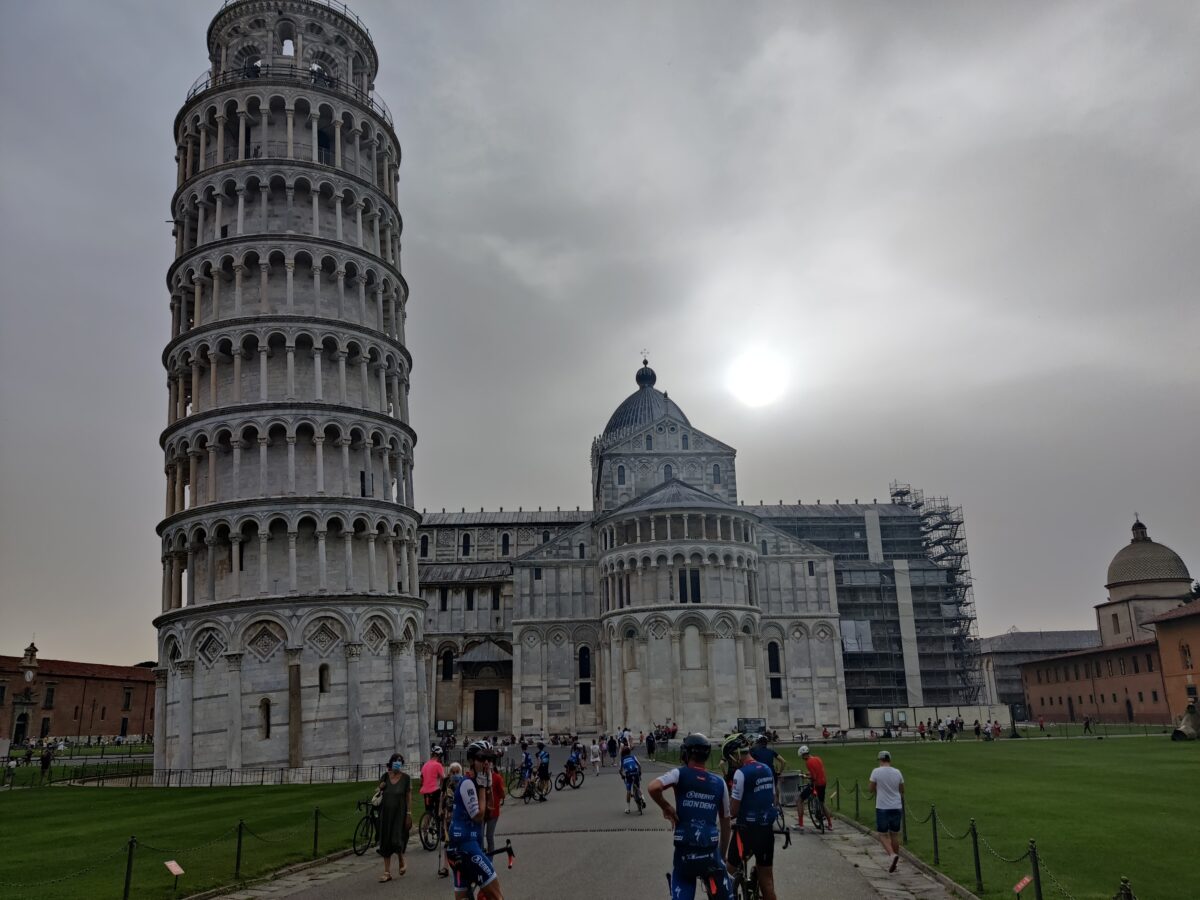 L’ingresso in piazza dei Miracoli è da brividi. Ci fermiamo a goderci i monumenti e a ricordare queste emozioni con chi sta a casa. Uno di quei momenti che capitano poche volte nella vita. Veniamo importunati da un brianzolo attirato dalle nostre biciclette svizzero-brianzole: “come da Cesenatico? Quando siete partiti? Bello il titanio… Dove andate?” rispondiamo a monosillabi, spero si capisca che siamo stanchi…