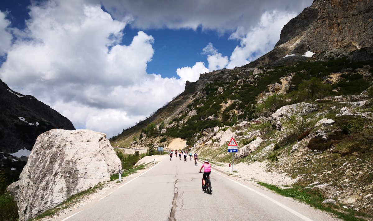 I Passi di giornata, nell’ordine sono: Campolongo, Falzarego e Valparola. Mentre le parole d’ordine sono: Eco, Sport e con voce emozionata Turbo. Il grande al secondo tornante si lamenta della velocità del gruppo e ci abbandona. Lo ritroveremo sul Falzarego dopo essere già stato sul Valparola, steso i panni e preparato tavola (tanto per citare due attività tra le più assurde a lui care…). Noi tre invece saliamo con calma, beviamo, ci fermiamo e raccogliamo i complimenti per quella che alla fine scoprirò essere una tra le più giovani, se non la più giovane, finisher dell’evento. Brava.