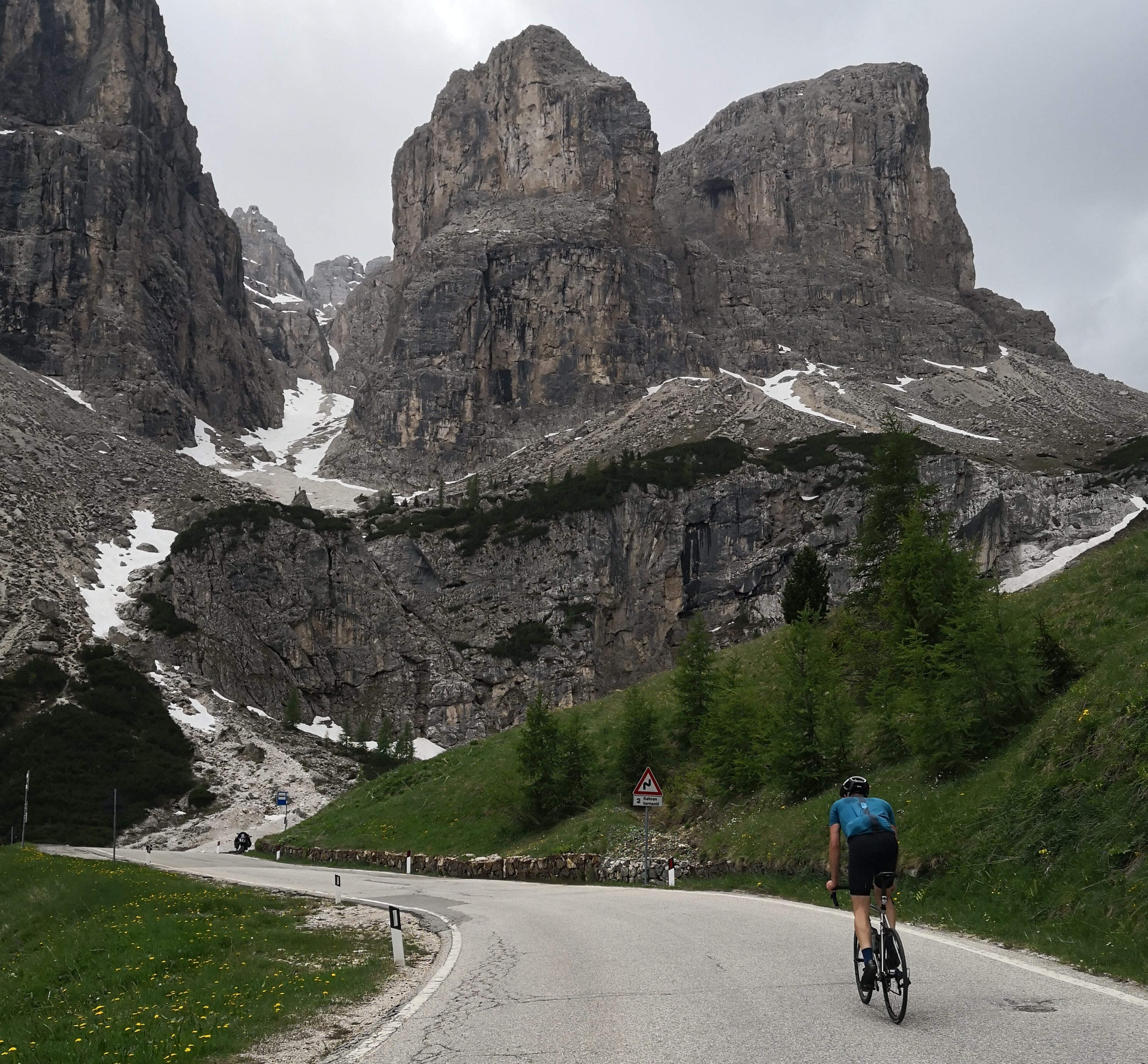 Chiudiamo con ancora 3 tacche. Propongo al grande una salita al Passo Gardena. Due calcoli veloci, un’attesa di 3 secondi per le verifiche in cloud: andiamo! Forse la salita più bella e appagante: pendenza impegnativa, ma tornanti che ti lasciano prendere fiato e traffico che ancora non era ripartito per la chiusura delle strade ancora attiva. Salire di fronte a certi monoliti colpisce anche il mio giovane compagno: “papà mi sento piccolo di fronte a queste montagne”. Mi parte un brivido nonostante il 10% che sto cercando di superare in piedi sui pedali e mi sorprendo che nonostante lo Stelvio, Fortnite e TikTok, riesca ancora a emozionarsi di fronte a tanta bellezza.