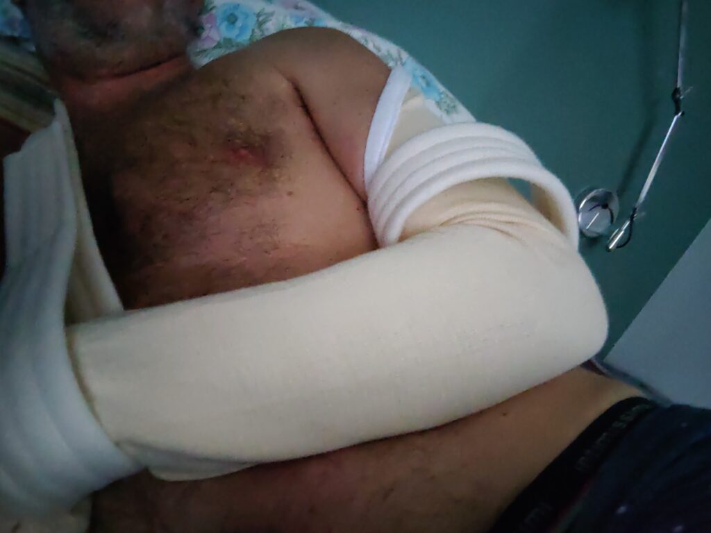Torno a casa la mattina del giorno dopo con un tutore che mi blocca la spalla e che in teoria non dovrei mai togliere, una gamba che non riesco quasi ad appoggiare ma che non ha problemi strutturali e le costole indolenzite.