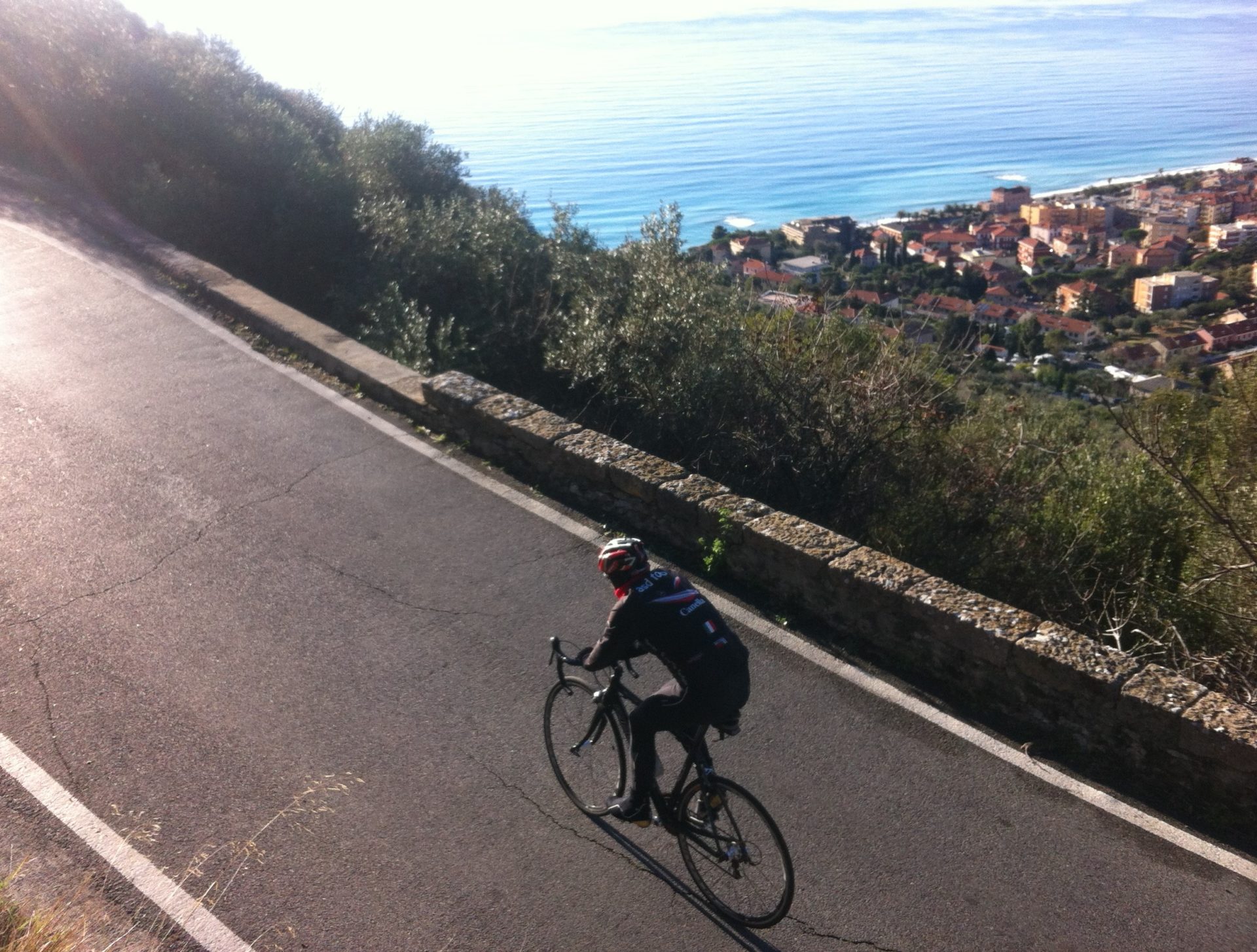 Basta andare in Liguria per trovare una decina di gradi in più che a nord dell’appennino (Alessandria 3 °C, Voltri 13 °C), dei colori che in Lombardia ci sogniamo fino ad aprile, una strada lunga 200 km a bordo mare dove ogni 5 minuti passano treni di ciclisti che ti portano a spasso a 35 km/h dando solo un filo di gas, poco traffico (d’inverno anche sull’Aurelia) e tantissime valli con strade selvagge da cui si può salire e scendere senza morire di freddo anche a gennaio, a condizione che non si scavalli nei versanti nord.