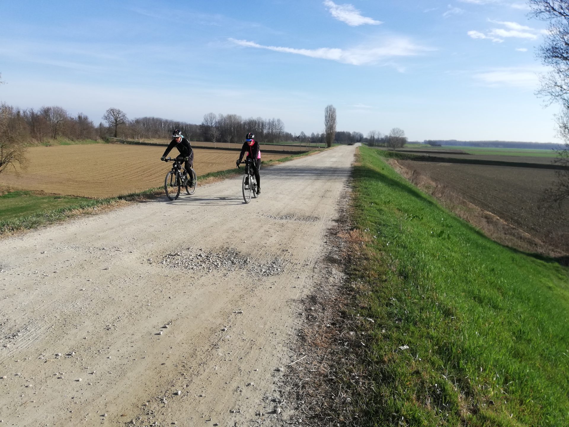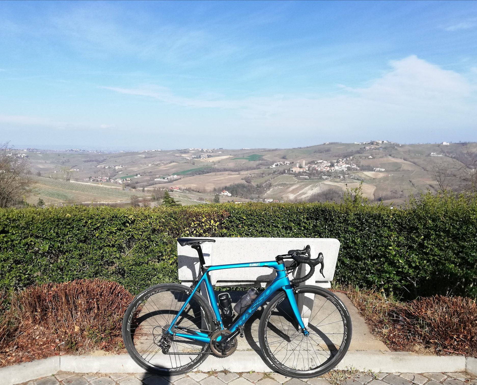 Per quanto sia bello pedalare tra i vigneti, farlo a marzo quando dei filari rimane praticamente solo il tronco nudo della vite più che un senso di appagamento lascia la sensazione di essere capitati nel posto giusto al momento sbagliato.