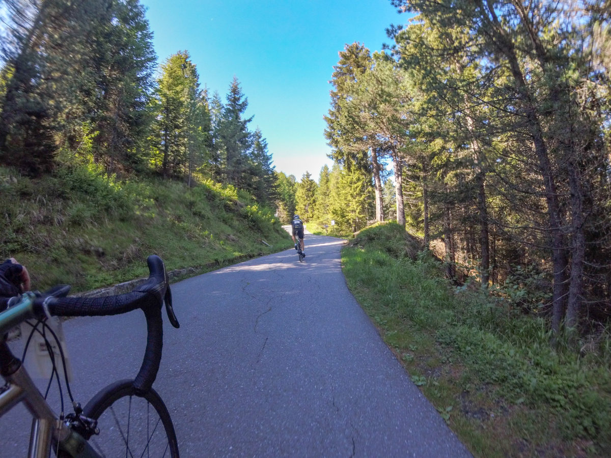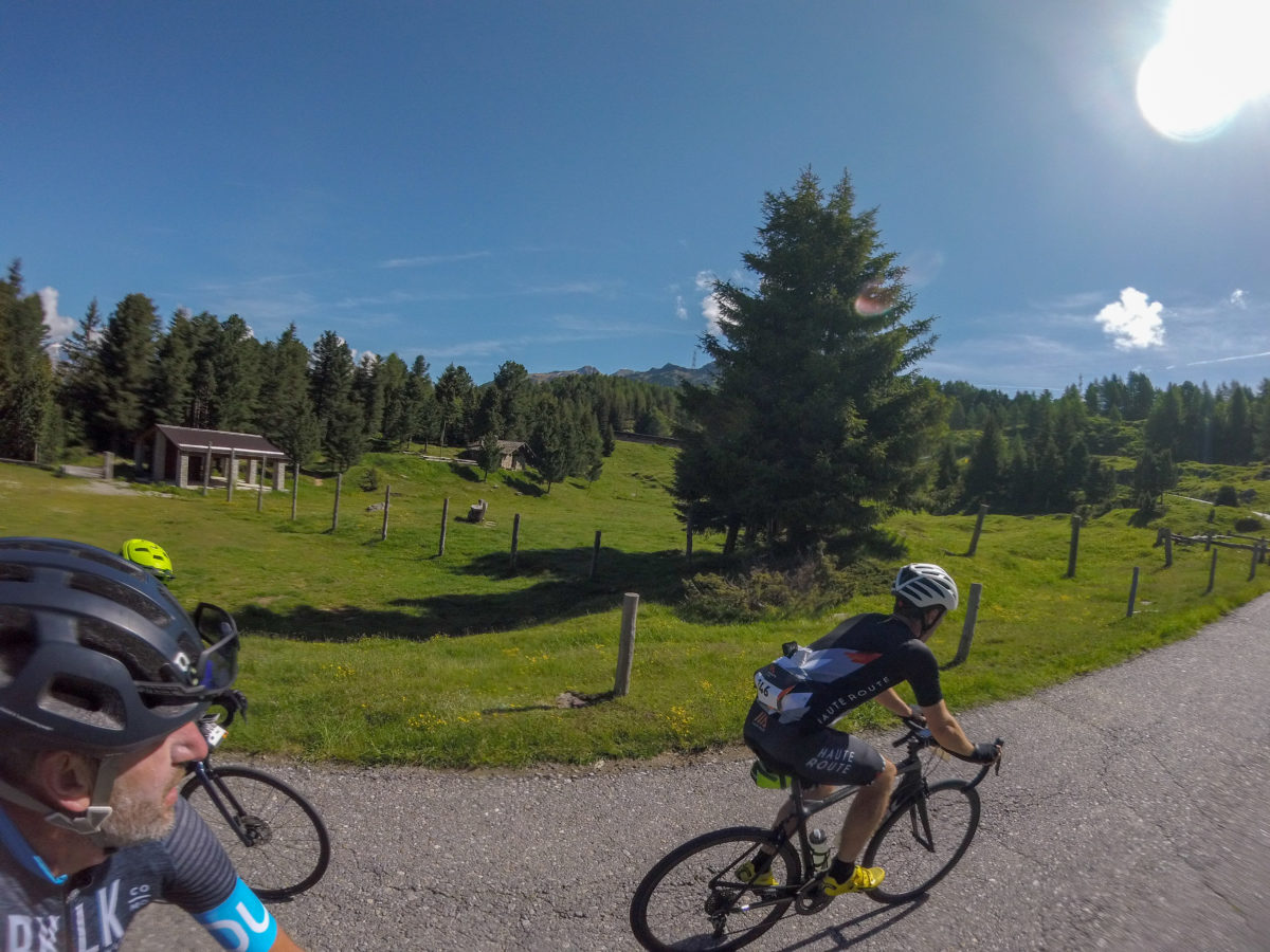 Che bella questa salita così regolare e che poche volte supera il 10% (mica il Gavia maledetto…). Aspetto i piani che conosco per prendere fiato e superare ancora. I tornanti sono la solita goduria con l’effetto catapulta: geni totali. Sull’altipiano sciolgo le gambe. Umbrail e via.