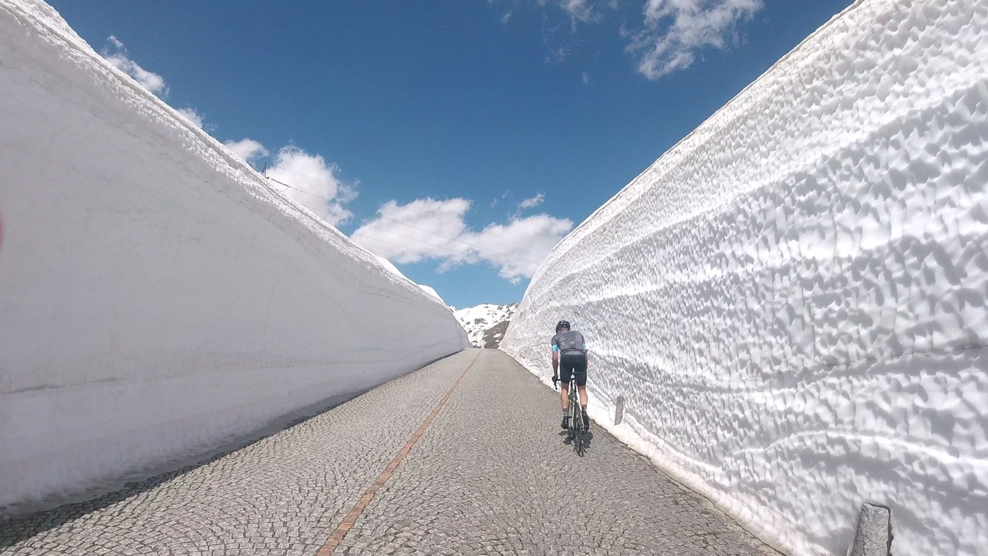 Arrivati al passo mi sono spinto oltre cercando di scoprire perché la strada continuasse a salire. Sono arrivato così tra due muri di neve, dove la strada passa tra le rocce quando il manto si scioglie. Un microclima incredibile e un tunnel spettacolare per chi non si ferma al piazzale del passo.