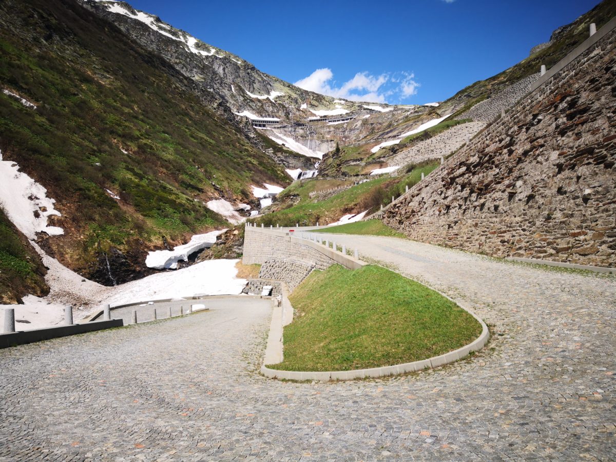 I primi chilometri della strada vecchia salgono dal centro di Airolo fino all’incrocio con la strada nuova, quest’ultima porta al passo chi vuole correre in auto o in moto. In questa parte ci sono solo alcuni tratti in ciottolato, preludio di quello che verrà poi. Arrivati all’incrocio bisogna fare attenzione a prendere la vecchia strada passando sotto lo svincolo che porta alla strada nuova. Tutto attorno ovviamente prati verdi e mucche al pascolo, l’immagine iconica della Svizzera, manca solo una coppia di AlpenHorn per chiudere il cerchio.
