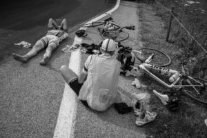 Abbiamo pedalato fino a lì per quello, per portare la mente in uno stato catatonico. Sono le 22.00 quando iniziamo il Manghen: 23,4 chilometri al 7%, per 1.600 metri di dislivello. Sono le 23.40 quando lasciamo la civiltà e iniziamo gli ultimi 7 chilometri con una pendenza media superiore al 9%. Si dice che la bellezza sia in tutte le cose. Si dice che la bellezza sia negli occhi di chi la guarda. Tutto vero, tutto giusto. Ma al Passo Manghen a mezzanotte è buio pesto. La bellezza, per quello sono lì, è essere solo, svuotato di fatica e di falsi problemi in un ambiente ostile. Viva la montagna. Penserei di essere morto. L’unica esigenza che ho è illuminare il cartello che ogni chilometro ti dice quale pendenza affronterai. Alle 00.59 siamo in cima. Bisogna solo portare a casa la pelle sulla discesa. Siamo nel salotto degli animali, sappiamo che li incontreremo. Un cervo a bordo strada, un cerbiatto l’attraversa. Ci mancano Lavazè e Pampeago, fanno 40 chilometri. Prendiamo mezz’ora di acqua, questa è gradita e ci sveglia. Ma sono le 2.40 e stiamo pedalando dalle 7. Dietro ci sono 415 km e 12.100 metri di dislivello. Dormiamo tre ore e mezzo e alle 7 ripartiamo. Siamo freschi e senza pensieri. E in quella condizione anche i muri al 18% sono solo muri al 18%. E comunque il Lavazè è in nomination per il premio di “salita più dura”. Dai che adesso che è finita mi inchino come Gelindo Bordin dopo l’oro di Seul. Invece mi guardo attorno, mi trovo in un catino naturale meraviglioso. Sul Latemar quando avevo dodici anni mi ci aveva portato mio padre. Facevamo sempre la seconda settimana di luglio in Dolomiti. Quella volta avevamo dimenticato i panini e avevamo solo sei pesche, le avevo io nello zaino, in un sacchetto di