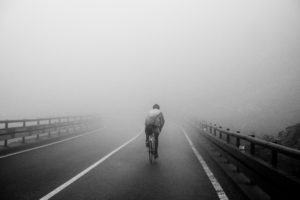 ho portato a fare le luci, e invece no. Giù acqua. Secchiate d’acqua. In cima al Valparola a rischiarare il cielo sono i fulmini. Sembra di essere in una cucina senza soffitto con le lampadine a led accese e fuori piove che Dio la manda. Calmi, ho detto a casa che se non fossi arrivato alla fine avrei segato la bici, e lo so che sono passate le 19.00 di sera e qui bisogna prendere una decisione, che sarà sbagliata. Troviamo un garage aperto al Falzarego e ci infiliamo. Stiamo lì dentro un’ora e fuori continua a metterla giù dura. E’ chiaro che al ristoro, dove sbaraccheranno alle 5, non arriveremo mai in tempo. Quelli lì zuppi saranno i nostri vestiti fino alla fine. Ma la fine è lontana 255 km, 9.000 metri di dislivello e 10 salite. Comunico lo stato della spedizione a casa e mi scrivono che non esistono condizioni avverse, esistono solo uomini arrendevoli. Se a casa fai il coglione in continuazione devi mettere in conto che qualche palla poi ti torna indietro. Più avanti deve essere perfino peggio (si parlerà di strade impraticabili ricoperte da grandine) se l’organizzazione comunica che il tempo deve intendersi azzerato, che