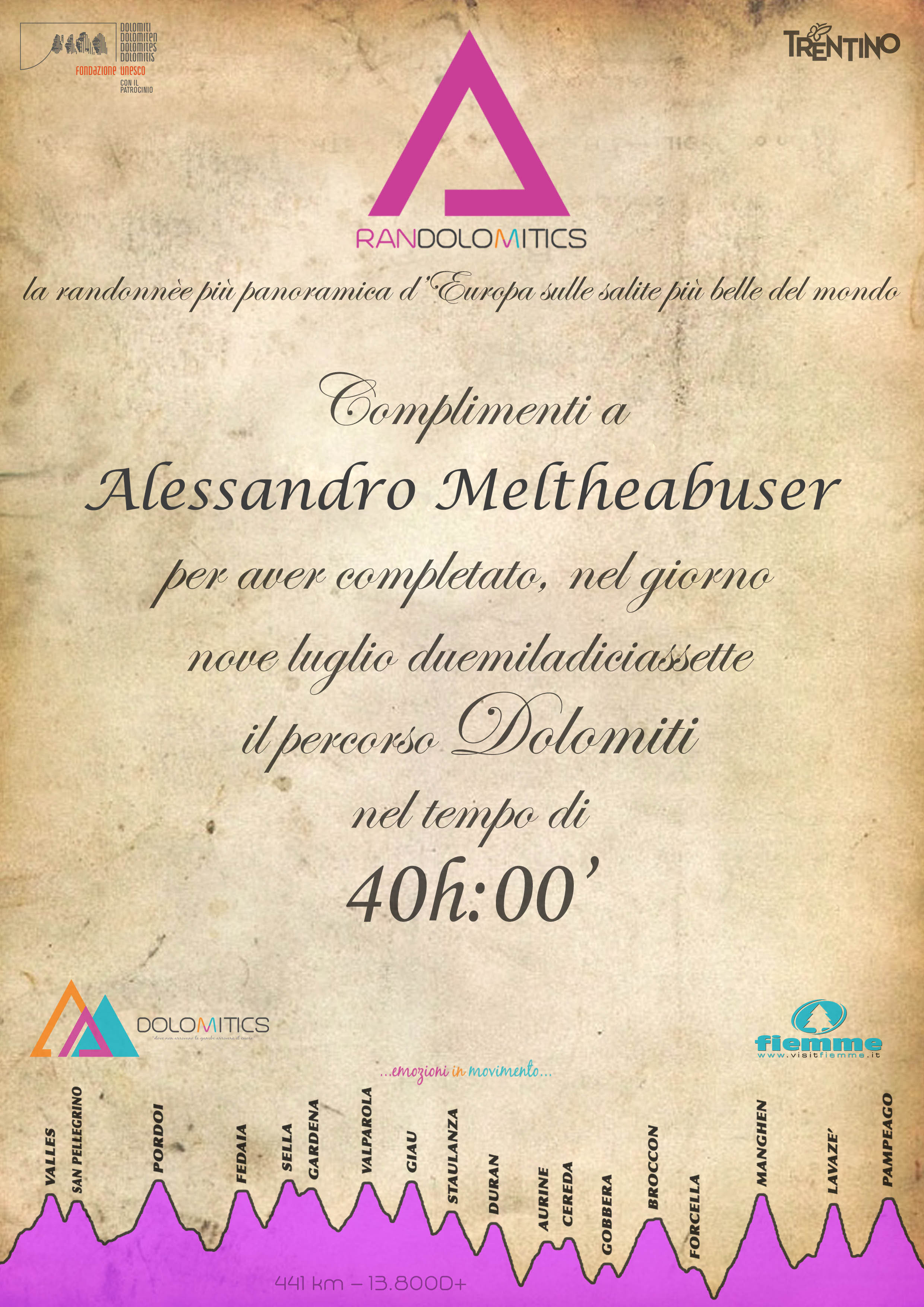 carta. Ma nel toglierle dallo zaino, le pesche rotolano in un dirupo. Tutte tranne una. Quando constatiamo che per loro non c’è più niente da fare e per noi non c’è più niente da mangiare, mio padre prende quell’unica pesca rimasta, mi guarda e dice che ovviamente quella è sua. Io rido e lui se la mangia. Sto ancora guardando il catino del Latemar e penso che presto ci porterò i bambini. Devono stare all’aria aperta. Abbiamo pedalato per 31 ore e 30 minuti, lungo 465 km, con un dislivello di 14.000 metri. Più della metà di quelli che sono partiti non sono arrivati. Sono arrivati in 45. Noi siamo ultimi, ma la mia bici è ancora tutta intera.