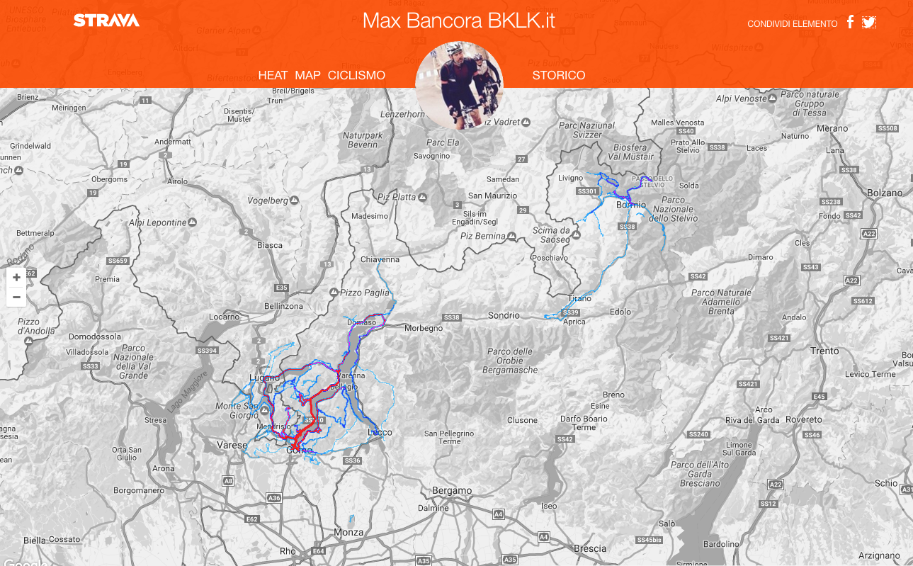 Ho sfrugugliato la heatmap per vedere le aree in cui ho pedalato nella mia breve carriera ciclistica, ed ecco che il lago di Como e la Val d’Intelvi si colorano di un rosso intenso mentre il resto ha delle macchie più o meno blu a seconda delle volte in cui sono passato. Per cui a Mallorca noto la traccia del mio giro, così come a Londra e nelle Alpi francesi alcune delle granfondo dell’anno scorso. Qualche tono più intenso lo scorgo attorno a Bormio dove d’estate ho girato sui passi e nei sentieri della zona.