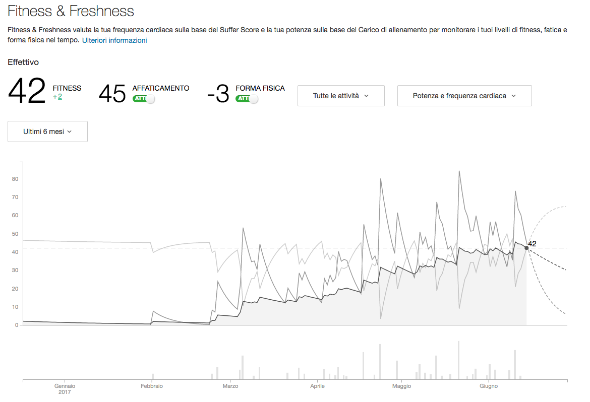 Ciò che sto apprezzando è il grafico Fitness & Freshness che indica lo stato di affaticamento del mio corpo secondo lo sforzo che sostengo durante le uscite e che determina anche la mia forma fisica. Nulla di scientifico, solo un indicatore utile per capire quando tornare a spingere per non rischiare di ritornare a casa distrutto dai dolori alle gambe…