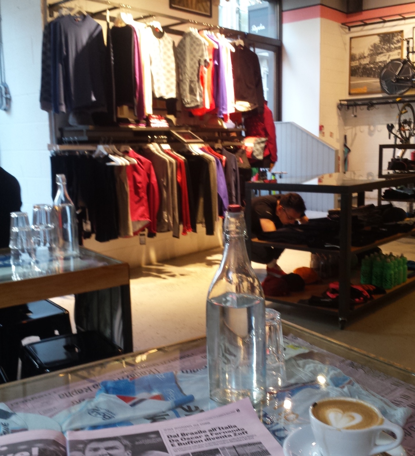 Prima di tutto vorrei chiarire che non si tratta di un negozio tradizionale, ma è un locale dove si respira aria di ciclismo in ogni dettaglio: la password del wi-fi è pantani75 #perdire. Mi sono seduto al tavolo a prendere un cappuccino e caso vuole che dopo aver preso la Gazzetta dello Sport (!) per leggere i commenti della partita della sera prima, parta l’allarme anti-incendio: tutti fuori e la mia voglia di shopping sfrenato contenuta a stento.
