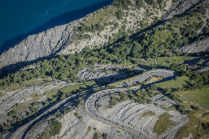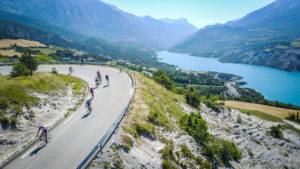 Si parte con 50 km di discesa, sulla carta anonimi, che però diventano belli non appena si lascia la strada principale e si iniziano i mangia e bevi a mezza costa. La cosa più bella in questa prima fase è comunque vedere il mix tra ciclisti con fisico da pro e ciccioni impresentabili, a cui non avrei dato un euro e che partono comunque per il Vars e l’Izoard, probabilmente lasciando detto a casa di non aspettarli neppure per cena (ed in effetti alle 10.00 di sera di ciclisti in giro ce n’è ancora tanti, ma qui hanno un altro spirito, al tempo impiegato sono interessati in pochi). In pieno relax (salvo il pensiero del dopo) si arriva dopo una cinquantina di chilometri al lago artificiale di Serre Poncon, sulla carta anonimo come tutti i laghi artificiali ed invece bello con le sue acque turchesi, soprattutto quando si sale e si scende dai tornanti della prima salita, la Cote des Demoiselles Coiffées.