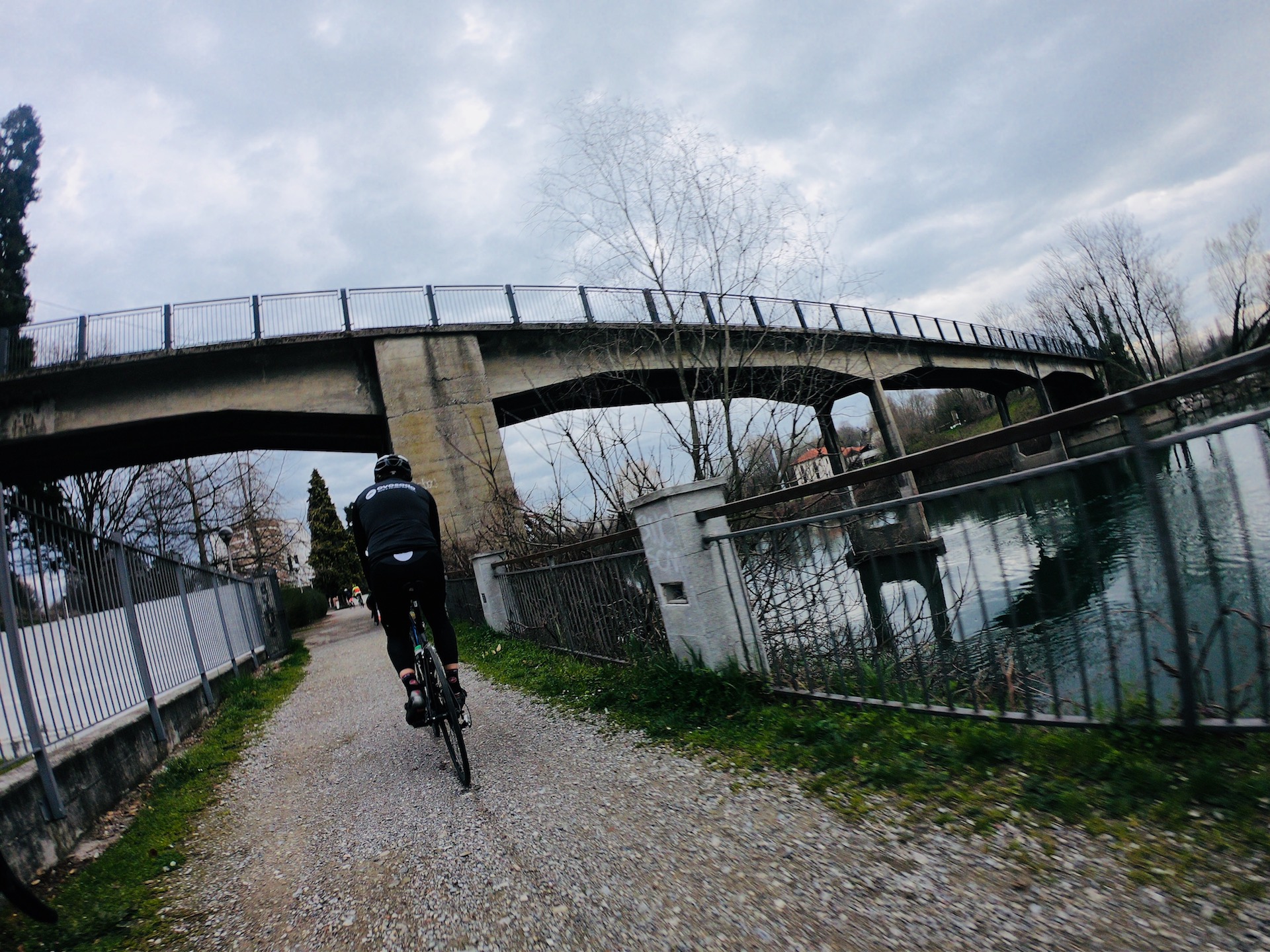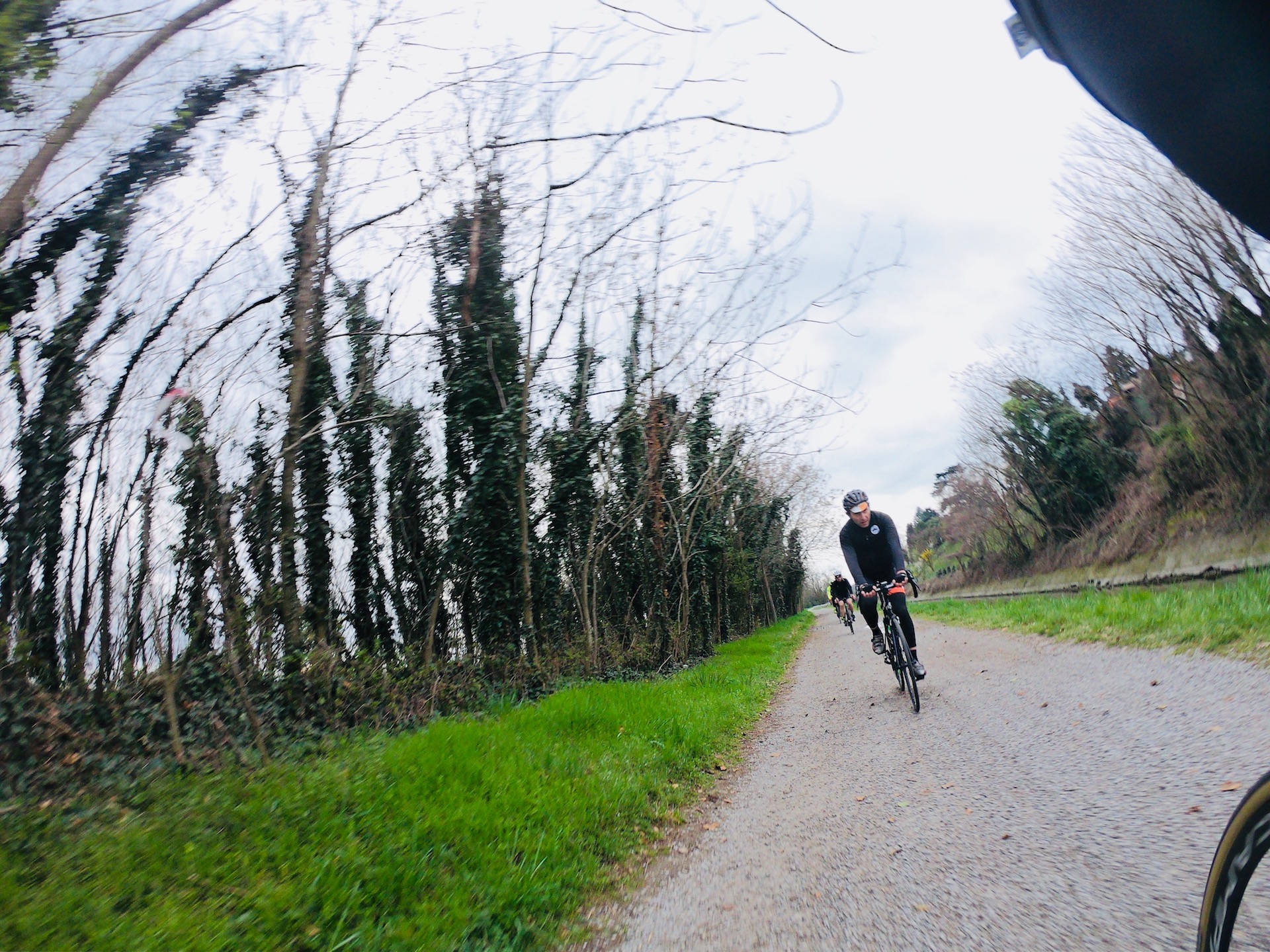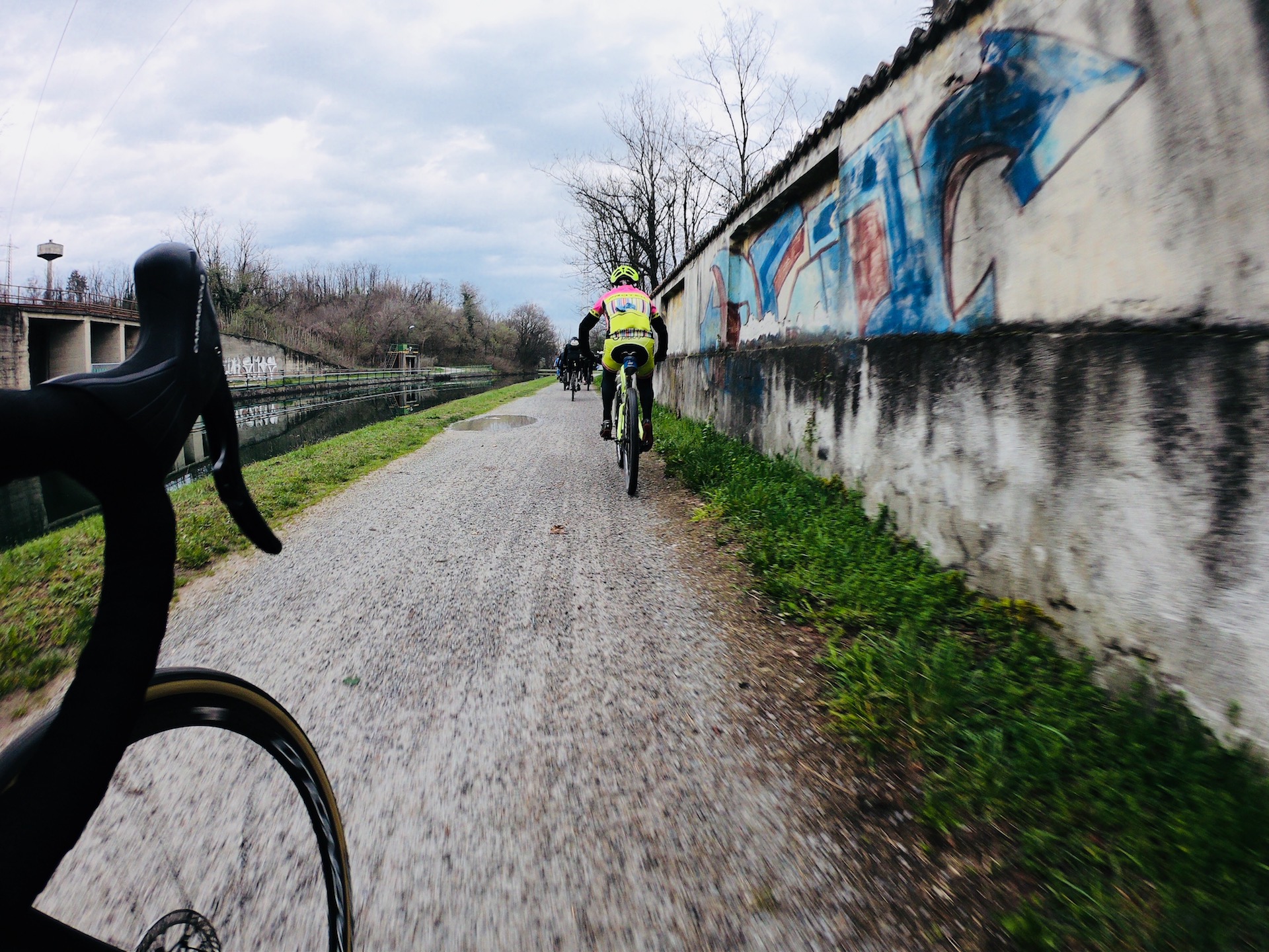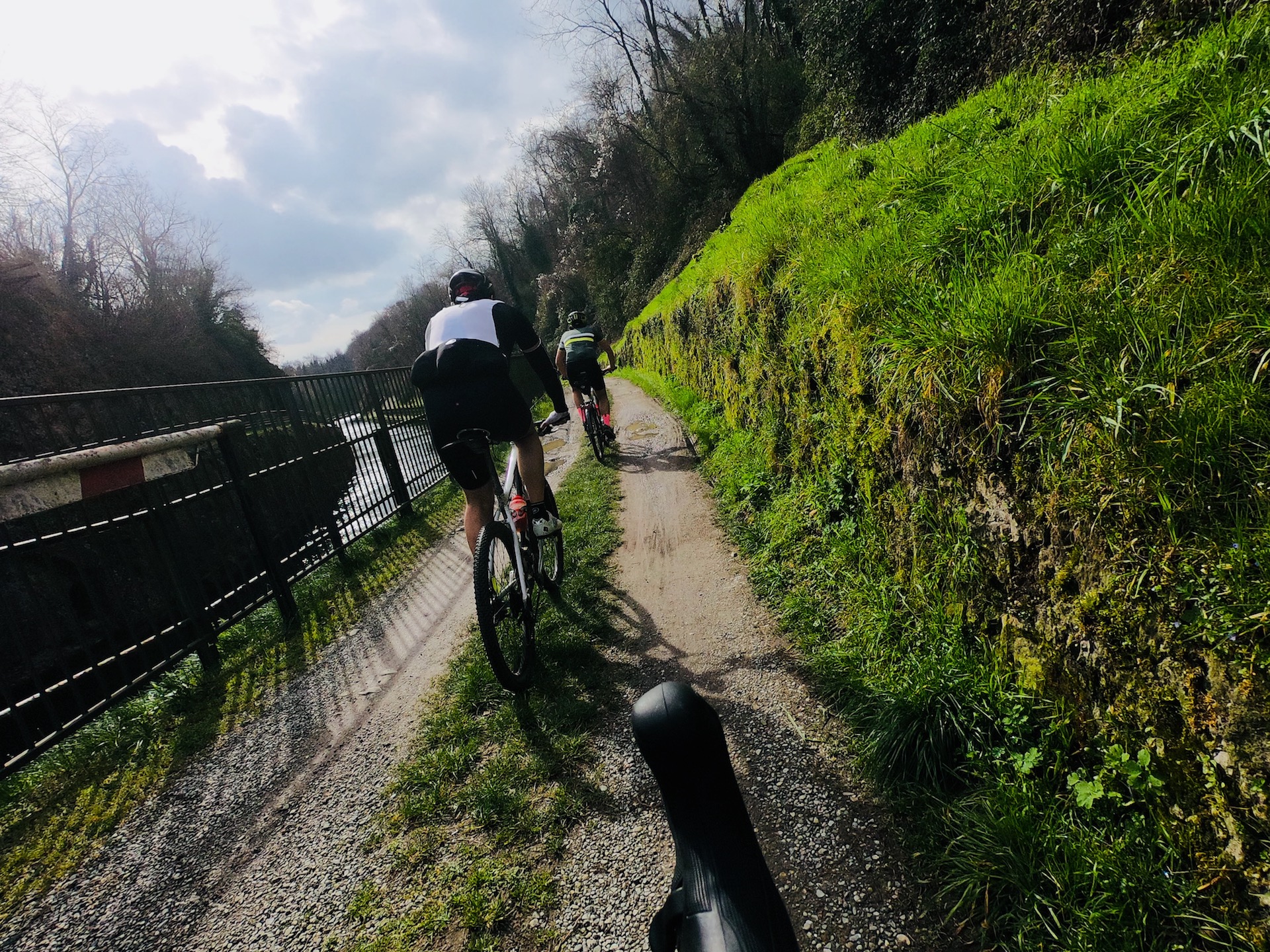 Si parte, un pò alla cazzo, un pò da soli, seguendo la traccia GPX sapientemente caricata sul mio Wahoo in 2 click alla facciazza di Garmin Connect. Io che non sono della zona capisco subito di essere proiettato in un universo parallelo, tra malinconici lungofiume che hanno vissuto momenti migliori, ma che col grigino di giornata trovano la perfetta cornice per una pedalata che nemmeno ci prova a pretendere di essere competitiva.