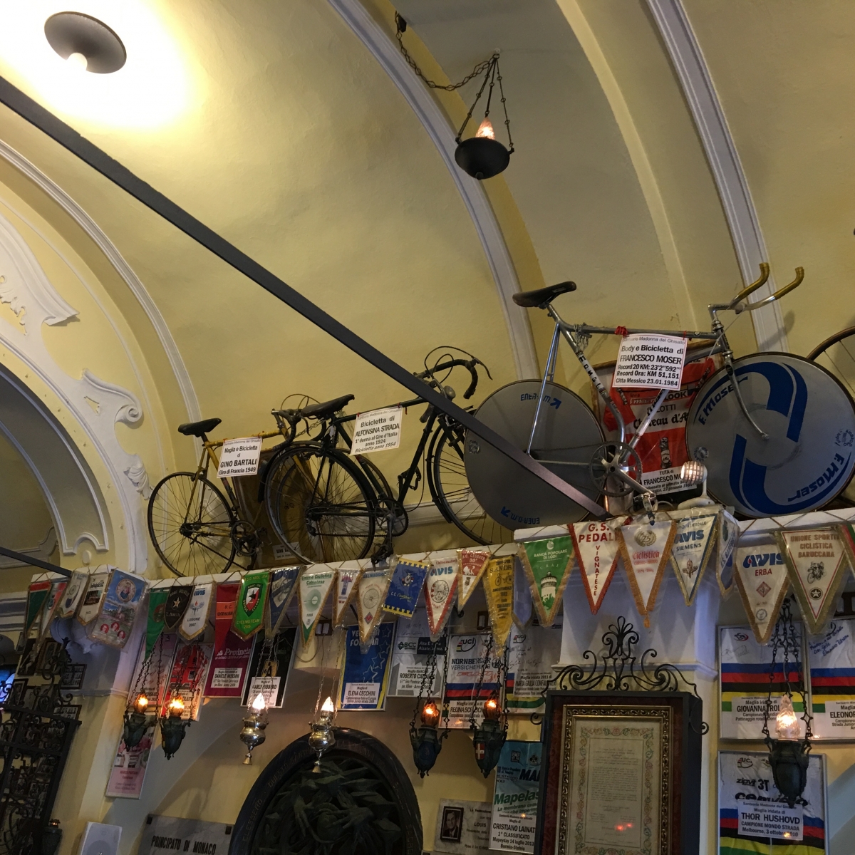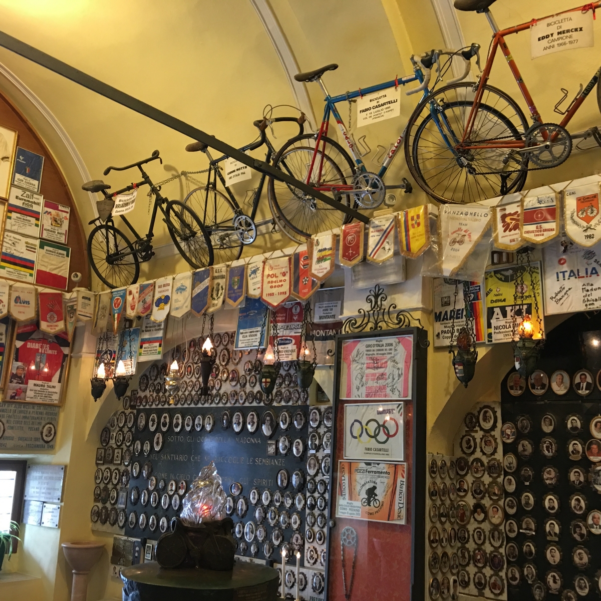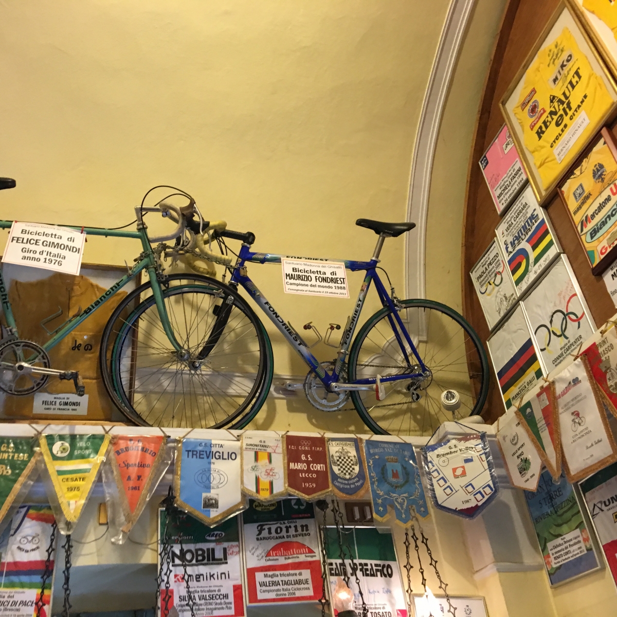 E’ la prima volta che Max passa da queste parti, ed è imprescindibile entrare nel museo, dove scambiamo 4 chiacchiere con una coppia di inglesi attorno ai 60 anni, che ci raccontano come lei fosse 6 anni che non saliva in bicicletta, e sia riuscita comunque a godersi la salita del Ghisallo, sfruttando tutta la tripla anteriore e la diversa mentalità, assolutamente turistica, con cui il ciclismo viene vissuto al Nord Europa. La visita al santuario della Madonna del Ghisallo (dopo anni, non ero mai entrato…) è un’esperienza quasi mistica, tra biciclette con oltre 1 secolo di storia ed altre che hanno solo 20 anni ma ormai sembrano presitoriche, tra magliette di Pantani e Bartali e foto di ragazzini meno famosi che sulla bici hanno perso la vita.